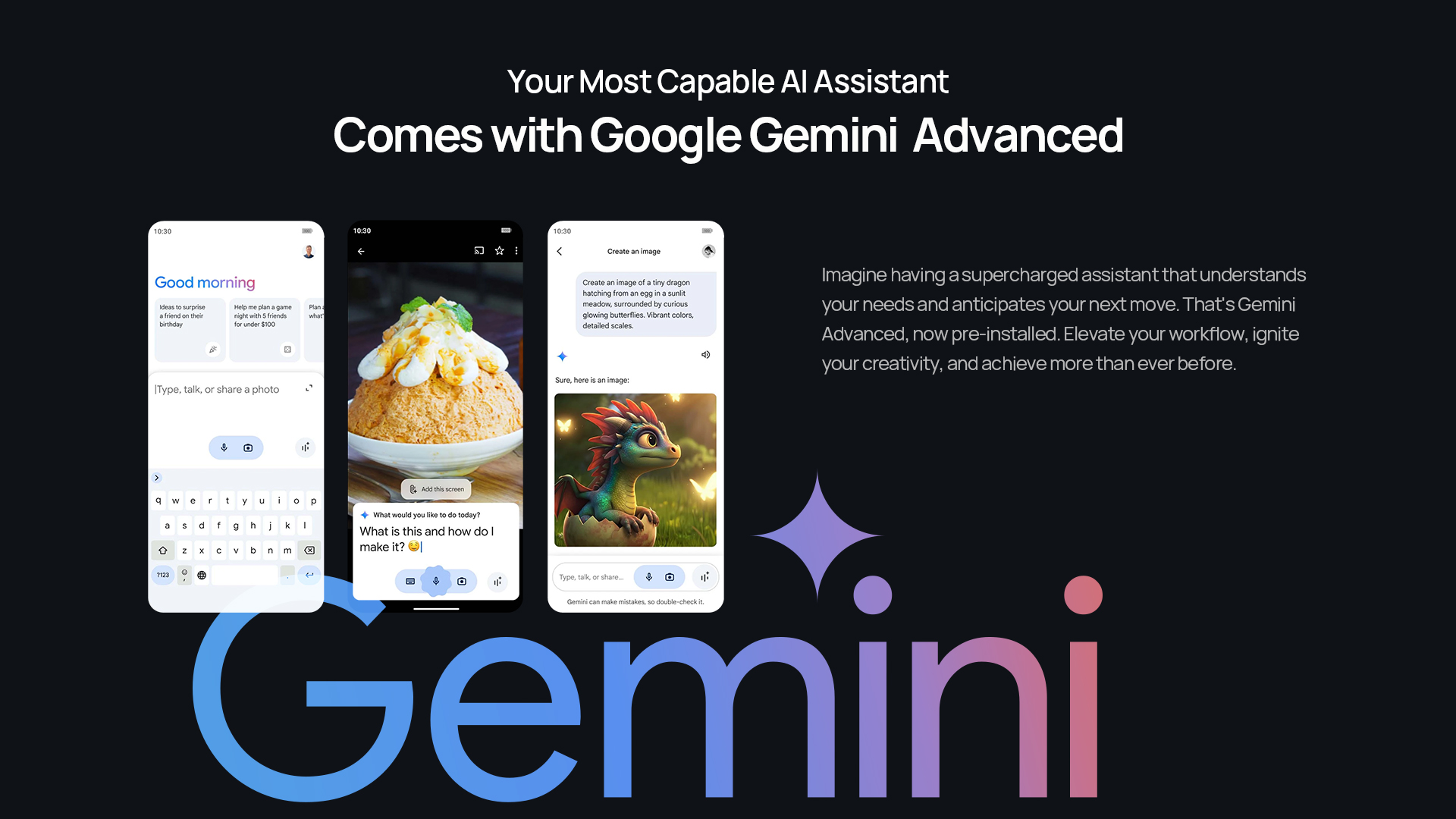 Immagina un assistente potente che comprende le tue esigenze e anticipa i tuoi prossimi passi. Questo è Gemini Advanced, ora preinstallato. Ottimizza il tuo flusso di lavoro, alimenta la tua creatività e ottieni risultati più che mai.